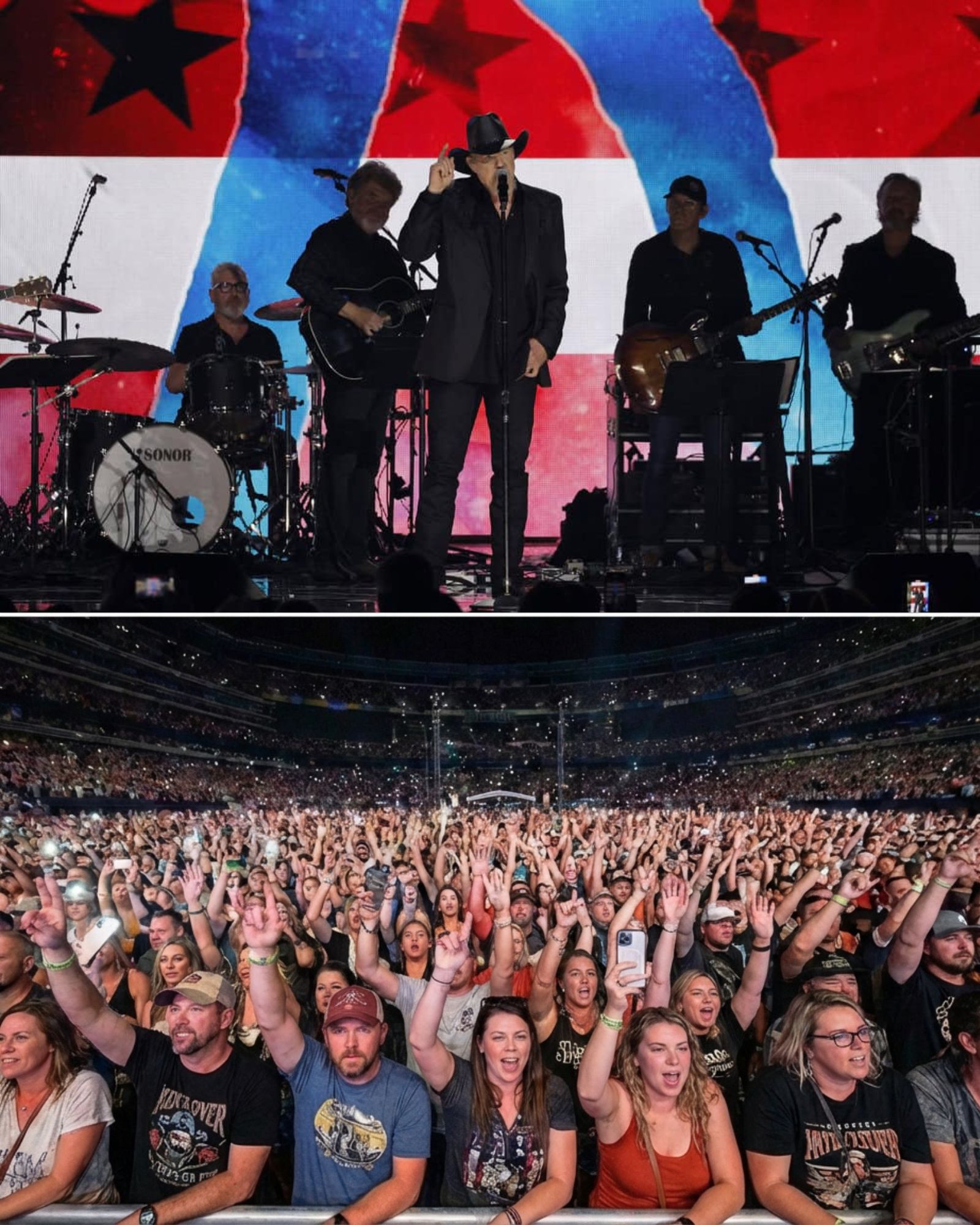 Trace Adkins stared out into the darkness beyond the lights with a focus that felt almost personal, almost private. No watery grin. No wink. No playful “how y’all doing?” The kind of expression that says: I’m here to do this right.