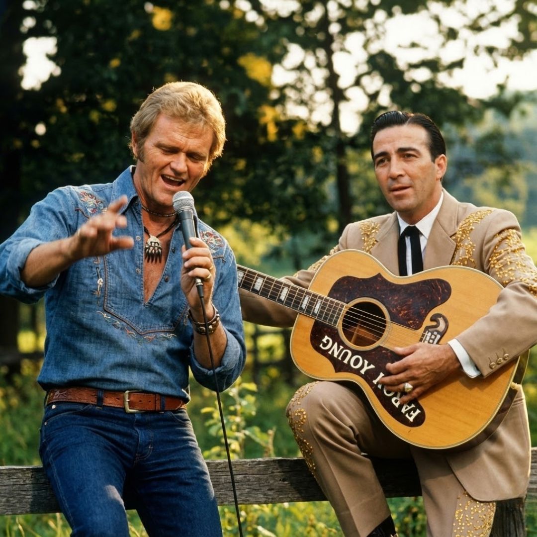 Jerry Reed and Faron Young sat side by side with fishing lines dipping into the river, letting the hours drift without naming them. The kind of day where nobody checks the time because there’s no reason to. The sun sat low, not in a hurry. Neither were they.