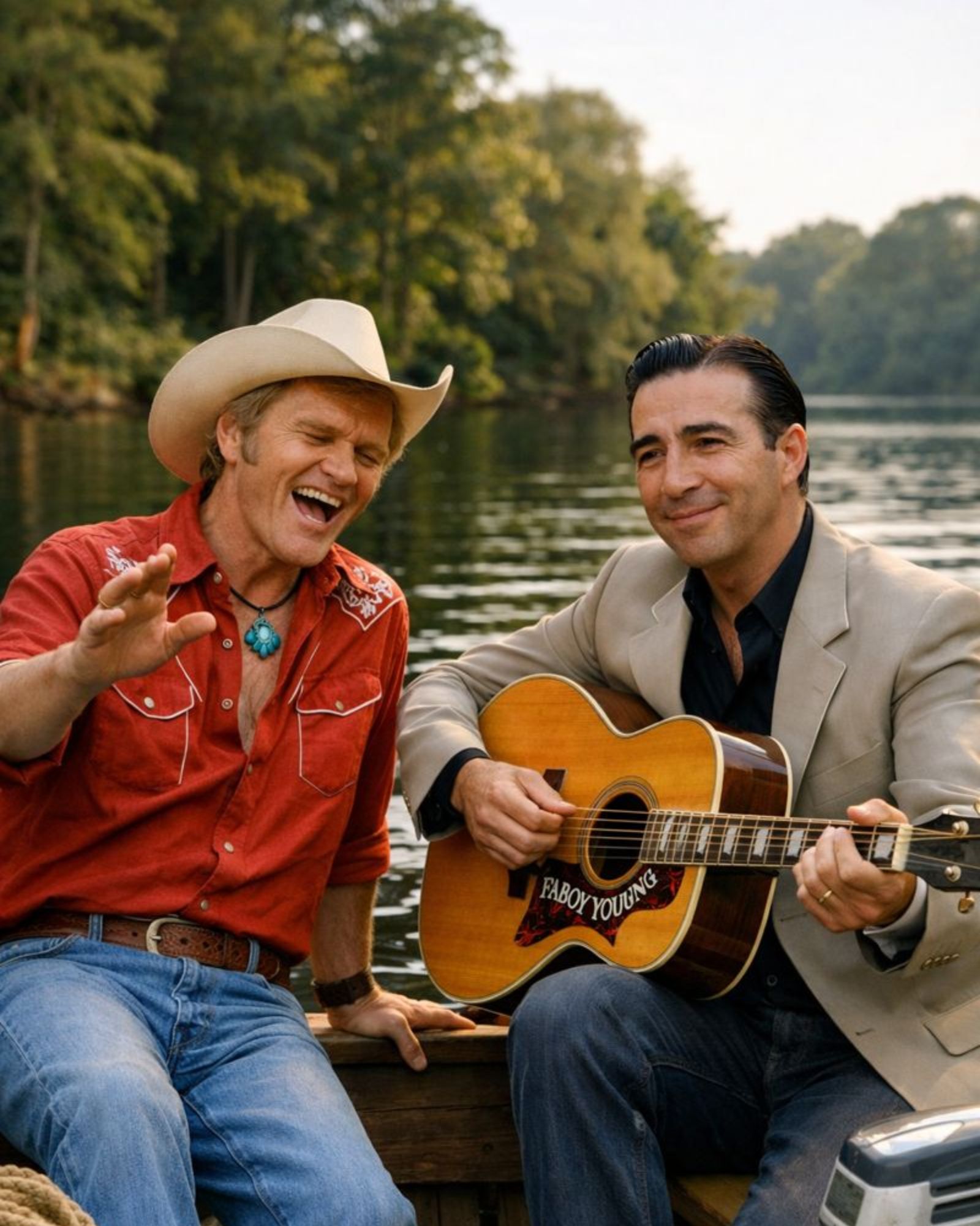 One quiet afternoon, long before nostalgia became profitable, Jerry Reed and Faron Young found themselves far away from stages and spotlights. No guitars strapped on. No schedules to chase. Just a slow-moving river, two fishing lines cutting the surface, and the kind of silence you only get when nobody needs anything from you.