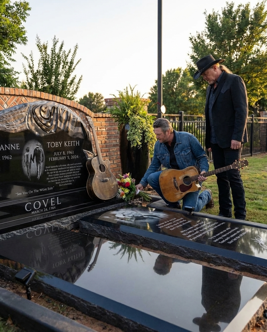 There was no public schedule. No social media post. No line of black SUVs. On the anniversary of Toby Keith’s passing, Blake Shelton returned quietly to Norman, Oklahoma, where fans have continued to honor the country giant’s memory. Standing beside Blake Shelton was Trace Adkins, a longtime friend who understood better than most what Toby Keith had meant to country music, to Oklahoma, and to the men who built careers in the same wide-open spirit.